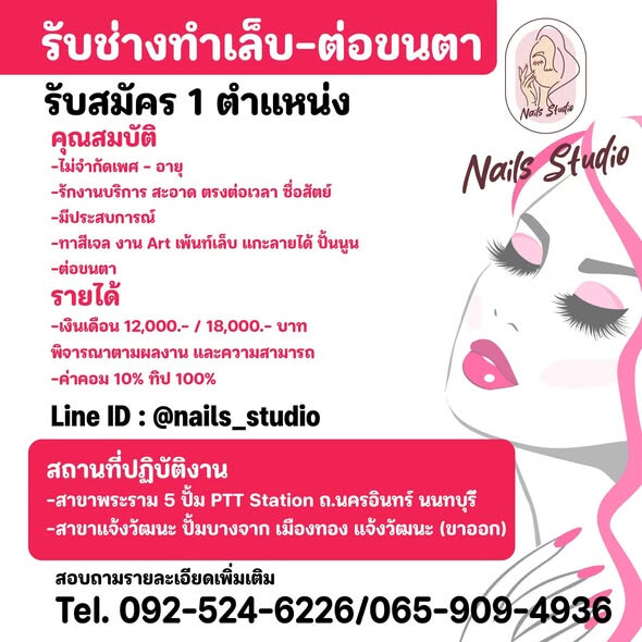 Nails Studio รับสมัครช่างทำเล็บ/ต่อขนตา 1 อัตรา (เมืองทอง / แจ้งวัฒนะ) เงินเดือน 12,000–18,000 + คอม 10% + ทิป 100%
